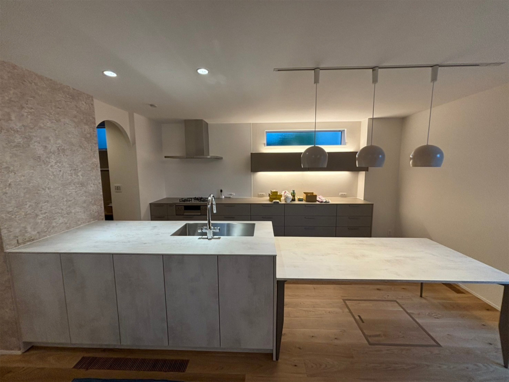 「家族が集まる」グレイッシュトーンの上質キッチン空間